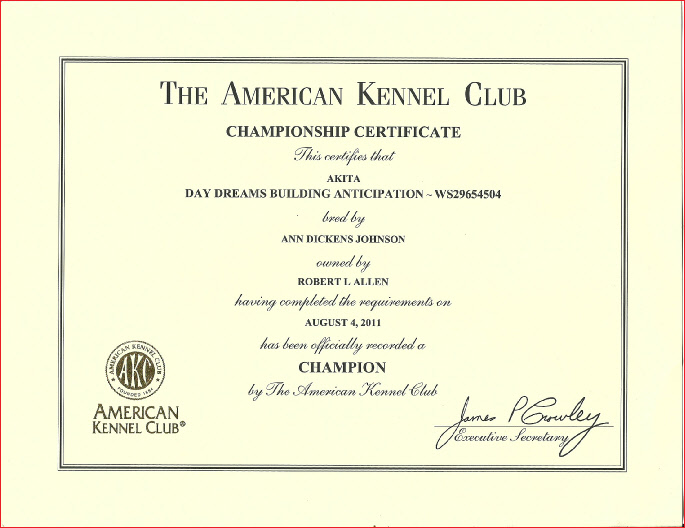 Sire’s call name is “Spencer”. He is a gentle giant and my right hand man. He comes from a long line of champions and on 8/4/2011 Spencer earned his AKC championship. Spencer is much larger now and a worthy sire indeed. New photos coming soon.